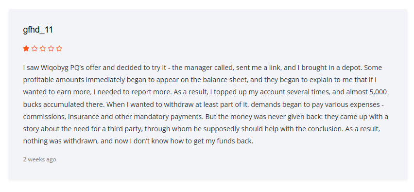 Victims consistently report losing their entire deposits, sometimes amounting to tens of thousands of dollars. Many state that Wiqobyg PQ deliberately preys on beginners and vulnerable individuals who lack experience with financial scams.